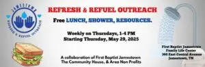 A weekly outreach program offers locals-in-need an opportunity to shower, enjoy lunch, and access free resources. Called “Refresh & Refuel,” or RNR for short, the Outreach takes place every Thursday afternoon from 1:00 to 4:00 pm at the First Baptist Church Family Life Center in Jamestown. Coordinated by The Community House, the outreach is staffed by volunteers from numerous area nonprofits and churches. The first Thursday of the month, free haircuts and beard trims are offered. Future plans include access to laundry facilities and more.